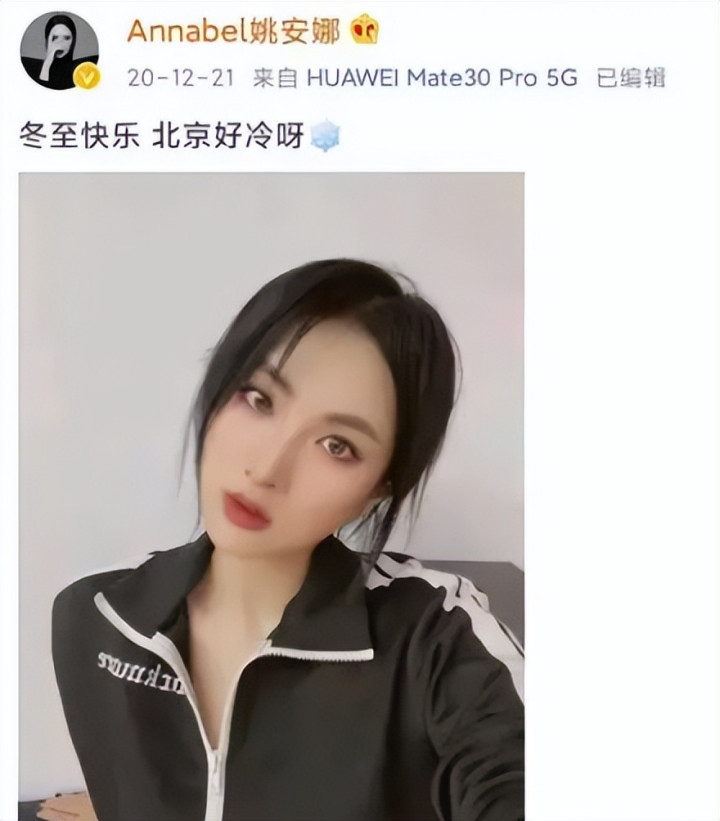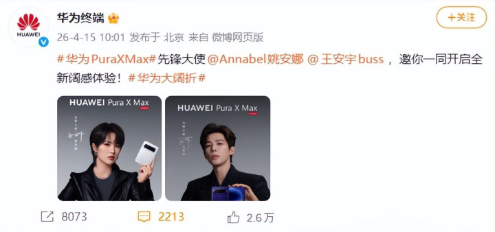 4月15日,华为与姚安娜共同发文,官宣成为华为新品的代言人。