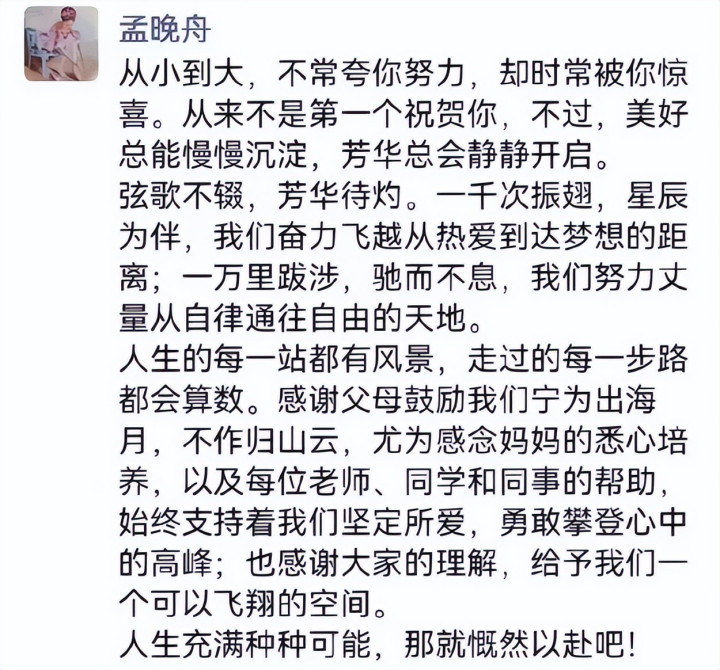 消息传来后,姐姐孟晚舟在朋友圈发文,为姚安娜送上了真诚的鼓励与祝福。